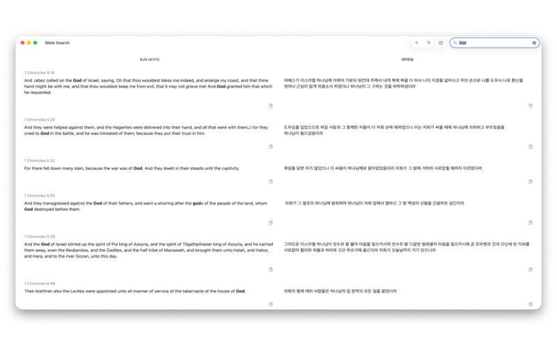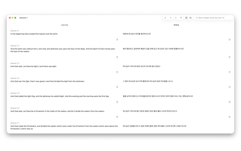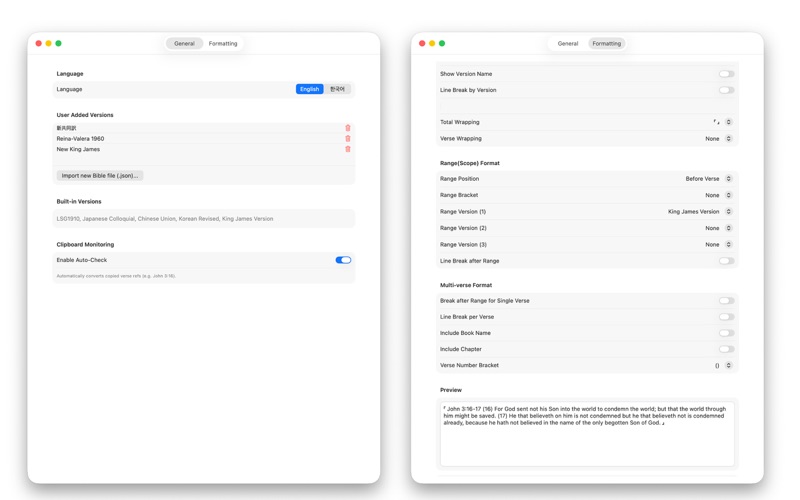 Click the BiblePaste icon in the menu bar to set your preferred format. Simply type a Bible abbreviation (e.g., Matt 2:2) in any text editor, then Copy (Cmd+C) and immediately Paste (Cmd+V) to insert the verse. 메뉴 바의 Bible Paste 아이콘을 클릭하여 서식을 설정한 뒤에 임의의 워드 프로그램에 성경 약어 (예시 : 마 2:2)를 입력 후 커맨드 C 복사 후 커맨드 V 붙여넣기를 하면 성경 구절이 입력 됩니다. Supported Languages: English, Korean 지원 언어 : 영어, 한국어